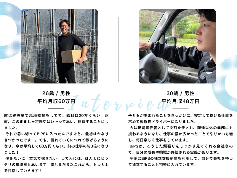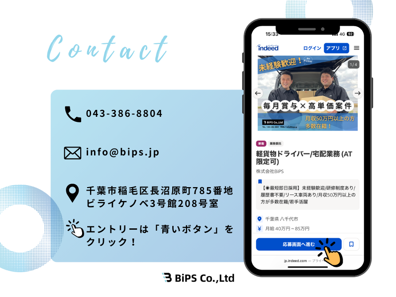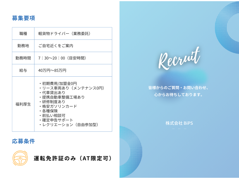 その他 | その他: 【応募~採用までの流れ】 < STEP1 >応募 \\ 簡単応募!即日採用! // ◉履歴書不要 少しでも興味をもっていただけたら、 お気軽にお声掛け下さい! ✆:電話からの応募 「0433868804」(選択2番) ✉:フォームからの応募 画面下の「青いボタン」から! ※ご応募いただいてから営業日3日以内に、 担当者よりご連絡差し上げます。 < STEP2 > 面接 ※履歴書不要/出張面接可 < STEP3 > 採用 ※合否は最短即日ご回答! ※面接日・入社日ご相談ください。 __________________________________________________ 【 代表メッセージ 】 皆さま、はじめまして。 株式会社BiPS 代表取締役 鈴木康祐と申します。 この度は弊社の求人ページをご覧いただき、誠にありがとうございます。 弊社は、 「安心して働けて、成長の機会がある会社」 であることをスローガンとし、社員一同、働く環境づくりに日々本気で向き合っております。 ドライバー様に「安心」「安全」「信頼」 をお届けするため、配送単価や日々の売上など、収入に関わることは、すべて明確に開示しております。 不透明さや不信感とは一切無縁の環境です。 また、業務サポートはもちろんのこと、 車両関連の設備、将来を見据えたキャリアップ支援、独立支援まで、長く安心して働ける環境を用意しております。 他社様との比較も・・・大歓迎です! その上で「BiPSがイイ!」と思っていただけた方は、是非、お気軽にお声掛け下さい! どんな方でも全力でサポートいたします! 皆様からのご応募、心からお待ちしております! __________________________________________________ 【 会社について 】 株式会社BiPS 本社: 千葉県千葉市稲毛区長沼原町785-3-208 ホームページ: https://www.bips.jp 採用サイト: https://bips.jp/driver-recruit __________________________________________________ 雇用形態: 業務委託 給与・報酬: 400,000円 - 850,000円 月給 |