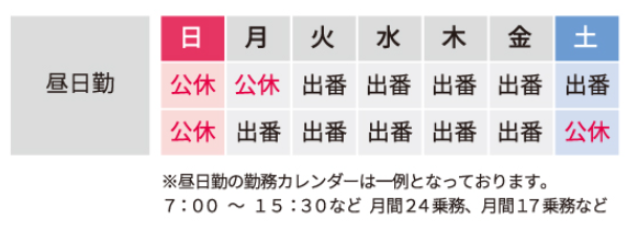 勤務時間 | 変形労働時間制 勤務時間詳細 実働時間:1日あたり7時間 平均勤務日数:1ヶ月あたり17日 〜 24日 7:00~15:00(休憩1h) ◆1ヵ月単位の変形労働時間制/月間171時間 ◆月間平均17~24乗務 ◆働くスタイルや勤務時間などの相談可 少し早起きして、夕方前には退勤! 健康的な生活スタイルを維持したまま、 安定して稼げる仕事です。 夕方からの勤務形態などもあるので、 希望者は応相談◎ |