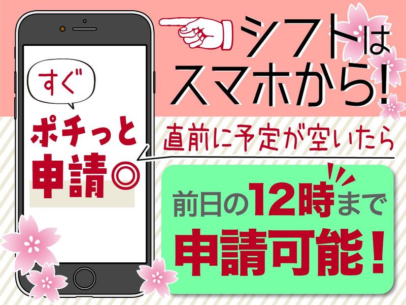 勤務時間 | シフト制 勤務時間詳細 【シフト自己申告制 7:30~16:30】 働きたい日の前日までに連絡するだけ! もちろん事前に希望日を頂いてもOKです!! ─────────────── \都合に合わせてシフトを申請/ ✅4h~の短時間OK ✅週0日でもOK ✅週末だけ・平日だけOK ✅午前or午後のみOK ─────────────── |