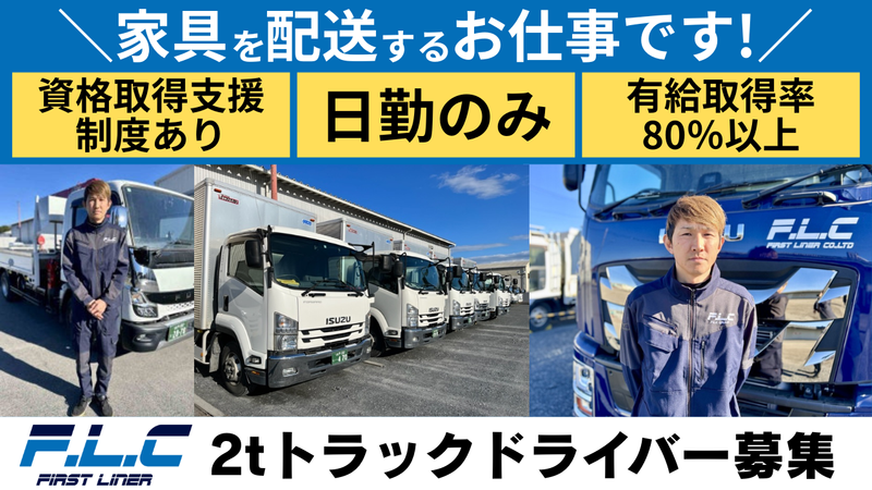 職種/仕事内容 | 仕事内容 地域に根ざし、 創業以来「安全・迅速・確実」をモットーに 成長を続けるファーストライナー株式会社。 今回は、各ご家庭への 『家具配送ドライバー』として 活躍してくださる仲間を募集します♪ ■お任せするのは・・・  ̄ ̄ ̄ ̄ ̄ ̄ ̄ ̄ ̄ ̄ ̄ ̄ 茨城県内のご家庭や店舗への 家具の配送・設置業務。 2人1組で作業を行うため、 未経験の方も安心して始められます。 お客様のご自宅に伺う機会も多く、 「ありがとう」と直接言ってもらえること が多いのも、この仕事ならではの魅力です♪ ■配送エリア  ̄ ̄ ̄ ̄ ̄ ̄ ̄ 基本的に茨城県内。 まれに近隣県への配送もありますが、 長距離運転はありません。 車両はパワーゲート付きで、 荷物の上げ下ろしもスムーズ。 積み込みから設置まで丁寧に進めることで、 チームワークや達成感を感じられるお仕事です。 ■働きやすさに自信アリ◎  ̄ ̄ ̄ ̄ ̄ ̄ ̄ ̄ ̄ ̄ ̄ ̄ ̄ 当社は「働きやすい職場認証」を取得済み。 有給取得率は80%以上と高く、 土日休みの希望も通りやすい環境です! シフト調整も柔軟に対応しており、家庭や プライベートとの両立がしやすいと好評です♪ === ファーストライナーでは “車好き”の社員が多く活躍中!! 自社でレーシングチーム 「HELM MOTOR SPORTS」や 民間車検場 「HELM MOTOR SERVICE」を運営し、 レース観戦(ツインクル茂木で年1回招待) イベント参加・自家用車の整備割引 などの特典も充実しています。 資格取得支援制度により、 中型免許やユニック・玉掛けなどの スキルアップも応援◎ 未経験入社から管理職にステップアップ した社員もおり、「運転が好き」から始まる キャリアアップを全力でサポートします! |