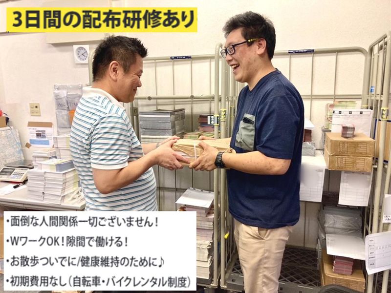 職場環境・雰囲気 | 職場環境 20代~70代まで幅広く活動中! 仕事は1人でコツコツと行いますが、 チラシの受け取りをする事務所は 話しやすいアットホームな雰囲気です。 |