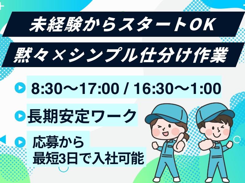 職種/仕事内容 | 仕事内容: ✨業界未経験大歓迎です! ✨職場見学・2週間お試し勤務OK! ✨登録から最短3日後に就業できます✊ 「次の職場を早めに確保したい」方を しっかりフォローします! ✨履歴書不要で面接方法選べる! 【お仕事内容】 金属部品の不要な部分を取るお仕事! ⏩ベルトコンベアーで流れてくる金属部品を治具にセット ⏩治具にセットした金属部品から不要な部分を取り除く ⏩不要な部分を取り除いた金属部品をワイヤーに通す シンプルな作業で、ラインのスピードも ゆっくりなので未経験の方でも安心です♪♪ 空調設備が完備されているので、 快適に仕事をすることができます! ✧˚ ⁺・✧˚ ⁺・✧˚ ⁺・✧˚ ⁺・✧˚ ⁺・✧˚ ⁺・✧ ✨安心のフォロー体制で長く働ける✨ ✅長期歓迎・未経験・ブランクOK 充実のフォロー体制で安心スタート♪ 就業後も当社スタッフがしっかり継続フォロー! 地域に根ざした職場で、安心して長く働けます◎ ゆくゆく正社員を目指す方も歓迎です! ✅未経験から成長できる! 新たな経験・スキルが身につけられます! 転職・就職に向けたスキルアップにも◎ ✨前払い・週払いOK✨ ✅頑張った分すぐお給料に反映◎ ✧・⁺ ˚✧・⁺ ˚✧・⁺ ˚✧・⁺ ˚✧・⁺ ˚✧・⁺ ˚✧ |