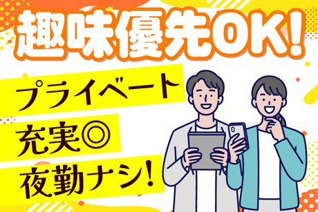 勤務時間 | 固定時間制 勤務時間 ~人気の日勤~ ●8:30~17:30※休憩1h 【勤務曜日】 月~金 |