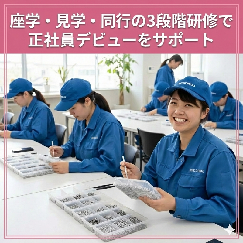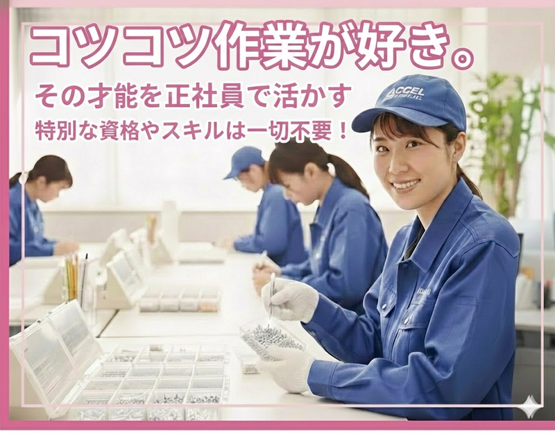 職種/仕事内容 | 仕事内容 アクセルでは、学歴やこれまでの経歴よりも、 「コツコツ黙々と作業することが好き」が 何よりの才能として評価します。 「ずっと派遣やバイトだったし、この年齢から正社員デビューなんて難しいよね…」 そんな不安を抱えていた30代の方たちが、 今、アクセルで「一生モノの安定」を手に入れています。 特別な資格やスキルは一切必要ありません 。 年間休日は実質131日、土日は完全にお休みです。 家庭を大切にしながら、定年まで安心して働ける 「自分らしい居場所」を、ここ西尾営業所でゼロから作りませんか? ▼▼▼ 文字だけでは伝わらない職場の雰囲気は… 公式YouTubeで公開中! 実際に働くスタッフや現場の様子をチェックできます ▲▲▲ 【公式】アクセルチャンネル https://www.758accel.com/company/ *\*\下記営業所でも積極採用中/*/* ●東海営業所(東海市浅山2-11) ●蒲郡営業所(蒲郡市竹谷町錦田10-1) ●知立営業所(知立市谷田町北屋下97-2) ●岡崎営業所(岡崎市大門3-6-16) ●豊田営業所(豊田市岩滝町高入51-8) ―――――――――――――――――― ※すべての営業所で【車通勤OK】 ※駐車場完備 顧客先へ訪問し、 自動車や産業用機械に使われる 片手に収まる大きさの部品を “コツコツ黙々” 目視チェックする シンプルな軽作業のお仕事です。 <具体的なお仕事内容> ・小型部品のキズ・割れの確認 ・不良品と良品の仕分け ・チェック項目に沿った目視検査 ※色を確認する作業があります 【STEP1】 検査・検品する部品(ガソリンポンプ部品等)の 傷や不備がないかを1つずつチェック! 拡大鏡を使ったチェックが中心です◎ 【STEP2】 規定通りのもの(=良品)は箱へ戻す 傷や不備があるもの(=不適合品)ははじきます 【STEP3】 最終的に良品・不良品の個数を数えて 報告書に数を記入しておしまい! 製品の不具合を見つけた際、その状況を正確に 漢字・ひらがな・カタカナを用いて日報へ記入する作業があります。 品質管理において、正確な言語コミュニケーションが欠かせないポジションです。 <1日の流れイメージ(日勤シフト)> ・7:00/営業所へ出勤!車で現場へ移動します。 ・8:00/顧客先へ到着したら、作業スタート! 一定数をコツコツチェック ・昼休憩(1時間) ・13:00/検査の続き+簡単な記録作業 ・17:00/片付け+業務報告をして作業終了! ・18:00/1時間程、残った業務を行います。 ・19:00/営業所へ戻り、翌日の作業内容を確認したら退勤! お疲れさまでした◎ 案件は西尾市・碧南市・安城市など、 営業所から車で30分程度の案件が中心です。 ※残業時間は1.25倍の残業手当対象です ※移動時間も”移動手当”が発生します! <このお仕事のやりがい> ■■黙々と集中して取り組める達成感!■■ 周りと無理に会話する必要がなく、 決められた作業にコツコツ向き合えます。 目の前の部品を丁寧に確認していくほど、 自分のペースで「できること」が 増えていく手応えを感じられます。 ■■自分の作業が製品の品質を守る重要な役割に■■ あなたが不良品を見つけることで、 お客様のところに届くトラブルを防ぎます。 小さな作業が大きな安心につながるため、 裏方として会社の品質を支える責任と誇りを実感。 ■■変化が少なく安定した環境で働ける■■ 扱う部品は軽量で覚えることも明確。 同じ流れを繰り返すルーチンワークに近いので 「慣れれば慣れるほど楽になる」仕事で、 自分のペースを大切にできることもやりがいの1つです。 <作業する環境について> ・室内作業が中心で天候に左右されにくい♪ ・少人数で落ち着いた雰囲気の職場 ■□安心の研修・サポート体制  ̄ ̄ ̄ ̄ ̄ ̄ ̄ ̄ ̄ ̄ ̄ ̄ ̄ ̄ ̄ ̄ 「いきなり現場」はありません。 あなたの不安をゼロにする初日。 入社後はまず座学研修からスタート。 ・現場で使う専門用語 ・安全に作業するためのルール ・指数計算のコツ など、 独自の教育プログラムに沿って丁寧に教えます。 現場に出てからも、教育担当の先輩がマンツーマンで並走。 「これ、どうやるんだっけ?」と何度聞いても大丈夫。 私たちが、あなたを絶対に独り立ちさせます。 ※座学研修では、安全ルールを理解するための日本語のマニュアルを使用します。 |