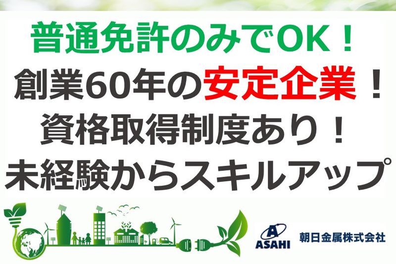 【アピールポイント】 【お電話でのご連絡はこちら】 朝日金属株式会社 本社工場 TEL:052-901-2111 受付時間:朝8時~18時の間にお願いします。 ■未経験の方も積極採用中! ■賞与年2回あり(前年実績2.8ヶ月) ■重機やフォークリフトの資格を取ってスキルアップできます!