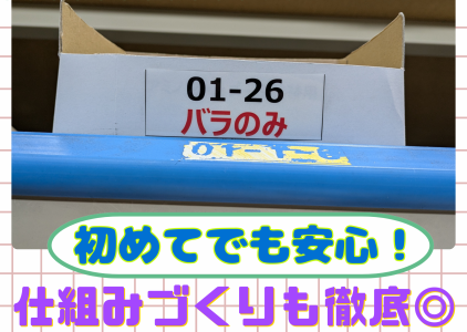 職種/仕事内容 | 仕事内容 *☆*――――――――――――――― 平日のみ&年間休日120日!私生活充実! 冷暖房完備!年中快適な倉庫内作業♪ 残業は完全選択制!定時も稼ぐも自由◎ 子育てがひと段落した主婦さん活躍中★ ________________*☆* 【仕事内容】 有名化粧品のカートピッキングと梱包作業の募集です! 作業はとってもカンタン★ 女性スタッフがメインで活躍中です! 重い物を持つような足腰への負担は少なめなのでご安心ください。 ~ 具体的には ~ *ピッキング デジタルカートの指示に従い、指定の棚から商品を取り出す作業 *梱包 集めた商品を確認・箱詰めし、ラベル類を正しく貼付する作業 ◤ 教育体制 ◢ ①最初はマンツーマンで2時間じっくりレクチャー。 ②カートピッキング(2ヶ月)→梱包(2ヶ月)と、ステップを分けて習得。 ③梱包では新人さん専用の作業スペースを用意。ベテランのサポート役が常に隣にいますし、「周りのベテランさんについていかなきゃ...」と慣れないうちから焦ることもないので安心です。 *―――――・・・・・・・・・・・・――――* / 現場マネージャーさんの 「働きやすさ」へのこだわり♪ \ 「50種類あるネイルの見分けがつきにくい」という声があれば、写真のように識別ラベルを導入するなど、スタッフの意見も取り入れながら仕組みづくりをしています! 「皆さんがスムーズに動けることが、仕事の精度に繋がる」という考えのもと、現場の声を大切にしています◎ / 「心配性」な方こそ大歓迎! \ ミスを防ぐ仕組み: 新人さんがピッキングしたものには「確認カード」を付け、梱包の際により注意深くチェックできる体制にしています。 「間違えたらどうしよう…」 という不安を仕組みでカバーしているので、安心してスタートできます。 / ライフスタイルに合わせた柔軟な働き方♪ \ 9:00〜18:00の勤務! 残業をするかどうかはご希望に沿って決定◎ 残業の上限時間も各個人の希望に沿って設定します。 「今月から19時までにしたい」 など、自己申告で途中変更も可能です♪ |