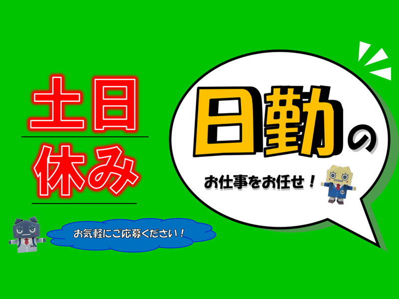 職種/仕事内容 | 仕事内容 \人気の倉庫内作業スタッフ+日勤のみ+女性活躍中/ スタッフの約8割が女性! 勤務時間は“8:00~17:00” 家庭との両立もしやすく、多くのママさんが活躍しています★ 作業はシンプルで力仕事なし! 髪色・髪型自由&ノーメイクOK♪ 働きやすさ抜群の環境で、新しいスタートを応援します! 【作業内容】 自動車シートカバーの軽作業スタッフ 1.シートカバーに不備がないのかチェック 2.決められた種類・個数に仕分け 3.仕分け済みの製品を梱包 こちらの作業以外にも、ピッキングのお仕事も募集中! 他の作業をご希望の方は、面談時にお問い合わせください。 |