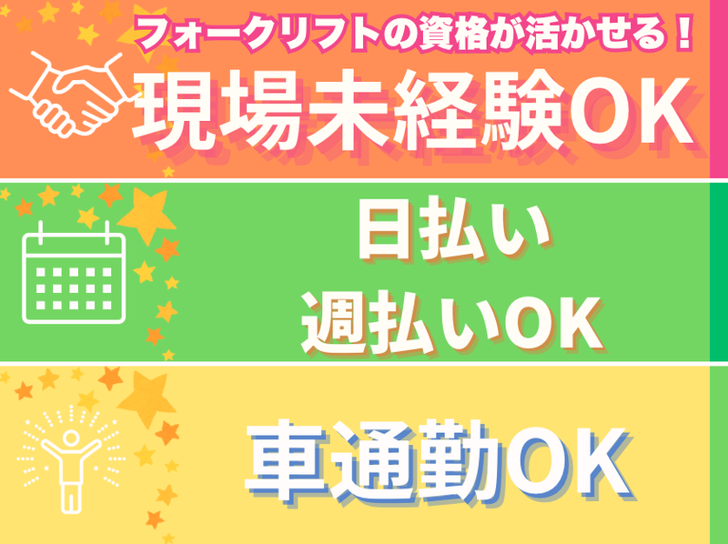 対象となる方 | 求めている人材 【こんな人におすすめ!】 未経験×一人でモクモクとやりたい方 \未経験大歓迎!サポート体制充実!/ ☆☆電話対応・嫌な人間関係なし☆☆ 自分のペースでモクモク作業! 専任担当者が24時間対応! どんな相談でもOK!! 【必須要件】 フォークリフトの免許 【歓迎要件】 ・製造・工場・物流倉庫などでの現場経験がある方 ・将来的に正社員を目指したい方 ・未経験者/経験者問わずOKです! ・コツコツ/モクモクとした作業が好きな方 ・チームワークを大切にできる方 ・業界大手企業なので、安定して稼げる ・優良企業なので、負担が少ない ◎未経験大歓迎! しっかりとした研修制度が 整っているので安心です。 ◎フリーター、主婦・主夫の方も積極採用中! 現場見学も可能ですので、 実際の仕事環境を見てから決められます。 まずはお気軽にお問い合わせください♩ ■急募 ■学歴不問 ■経歴不問 ■経験者歓迎 ■男性活躍中 ■女性活躍中 ■未経験OK ■ブランクOK ■主婦・主夫歓迎 ■フリーター歓迎 ■WワークOK ■第二新卒歓迎 ■業界未経験歓迎 ■未経験者歓迎 ■知識不要 ■経験不要 |