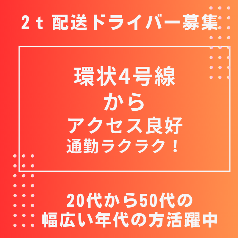 対象となる方 | 求めている人材 【必須条件】 *要中型免許※5t限定以上、経験者優遇!未経験者も歓迎! *お客様とのコミュニケーションが取れる方 【こんな方に】 *未経験の方は充実した研修体制があるので安心♪ *経験者の方は即戦力として月収アップも可能!! ・3tトラックドライバー・大型トラックドライバー経験者歓迎 ・タクシードライバー・軽貨物ドライバー・フードデリバリー配達員からの転職歓迎 ・建築業・製造・工場内軽作業・飲食店・営業職・事務員など他業種からの転職歓迎 【多数エリアから通勤可能】 ・横浜市泉区・栄区・港南区・戸塚区・保土ヶ谷区 ・横浜市瀬谷区・緑区 ・綾瀬市・藤沢市・海老名市・厚木市・大和市 ・座間市・町田市などからも通勤可能 |