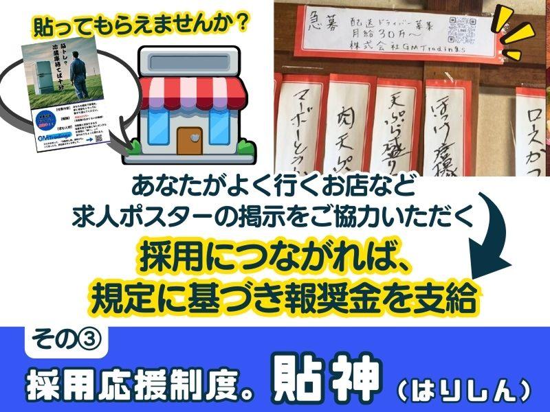 待遇・福利厚生 | 【保険制度】 雇用保険、労災保険、健康保険、厚生年金 【福利厚生】 待遇・福利厚生: ■交通費支給(規定あり) ■社会保険完備 ■服装自由(安全靴貸与あり) ■髪型・髪色自由(奇抜でなければOK) ■空調服着用でのお仕事OK(費用一部会社負担) ■日払いOK・週払いOK ■オフめし設置あり(格安で購入できる!) ■社長めしあり(絶品&本格的なのが最高!) ■スポーツドリンクの支給あり(熱中症対策) ※消毒液の設置など、基本的な衛生管理も徹底 \さらに進化!当社ならではの独自制度/ ■褒めログ制度 日々の業務の中で見つけた 「誰かの良い行動」や「感謝」を社内で共有する取り組みです。 ■貼神(はりしん)制度 行きつけのお店などに求人ポスターを 貼ってもらえるようお願いし、採用につながれば報奨金を支給。 <支給条件> 正社員・契約社員:試用期間終了後 アルバイト:60回勤務後 <支給額> 1人目3,000円/2人目5,000円/3人目8,000円/4人目1万円/5人目以降は1名につき1万円 【センター情報】 ・1日の稼働人数:20名以内 ・平均年齢:30歳前後 ・男女ともに活躍中 ・現場リーダーは女性で、なんでも相談しやすい雰囲気です ▼当社HPはこちら https://gmtradings.co.jp/ |