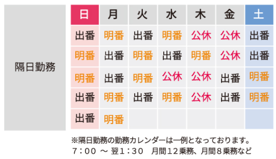 勤務時間 | 変形労働時間制 勤務時間詳細 総労働時間:1ヶ月あたり160時間 7:30~翌1:30(休憩3h) ◆1ヵ月単位の変形労働時間制/月間171時間 ◆働くスタイルや勤務時間などの相談可 《 - 1日のスケジュール例 - 》 【7:30】 始業!点呼や車両点検・清掃を済ませます。 【8:00】 出庫/エリアを周回します。 【12:00】 休憩/1時間程度。自宅に戻る事もあります。 その後、エリアを周回します。 【15:00】 休憩/1時間程度。好きな場所で休憩します。 その後、エリアを周回します。 【19:00】 休憩/車内で仮眠 その後、エリアを周回します。 【翌1:00】 事務所へ戻ります。 社内の点検、集計など。 【翌1:30】 終業!お疲れ様でした! |