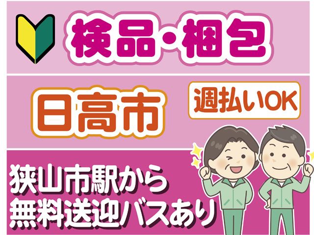 日高市で商品の検品・梱包作業 日勤、土日休み 50代までの男女活躍中!