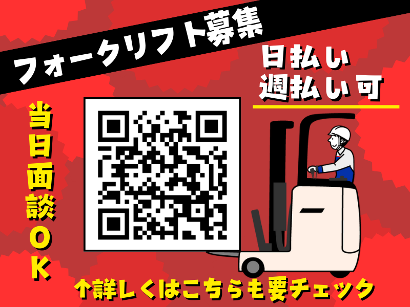 職種/仕事内容 | 仕事内容 食品や飲料などを扱う倉庫内にて リーチリフトを使った入出荷・移動作業を お任せいたします。 ▼▽求人のおすすめポイント▽▼ ✅車・バイク・自転車通勤OK! ・無料駐車場完備で通勤ラクラク♪ ✅時給1,500円×日勤のリフト作業 ・残業時は時給1,875円と高時給! ・日払い・週払いもOK! ✅残業ありで最大月収35万円! ・落ち着く1月などは月に20h程と、 繁忙期(12月)は残業40~50h、 メリハリをもって稼げます◎ ✅リフト作業6割×手作業4割 ・乗りっぱなしではなく簡単な手作業も あるので、程よく気分転換に ・20代・30代・40代スタッフ活躍中 ✅冷暖房・休憩室完備・喫煙室あり ファンベストやスポットクーラーも貸与 ✅お仕事の流れ ・リフトで商品のある棚に行く ▼ ・商品のパレットをトラックの前まで移動 ▼ ・在庫が来たらパレットを棚に積む ◎基本的に上記作業の繰り返し! |
