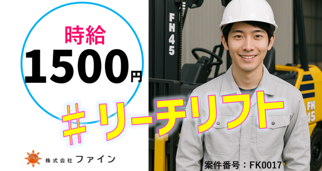 \高時給1500円/快適な冷凍庫内でのリフト作業!フォークリフト免許と経験が活かせます! ◆案件番号FK0017◆ お電話で案件番号をお伝えください♪ ◆夏には快適な冷蔵・冷凍庫内のリフト作業 ◆防寒着の貸与ありでオールシーズン快適にお仕事できます ◆夜勤もありでしっかり稼げます ファインで働く \ おすすめポイント / ◎社員登用の実績あり →長期で安心して働きたい方にピッタリ ◎うれしい週払い制度あり(規定あり) →貯蓄にまわして旅行の積み立てや 先に支払っておきたいお金など、いろいろご活用いただいてます ◎土日祝休み(会社カレンダーあり) ◎残業代はきっちり支給です! _______________ \ ファインが選ばれる3つの理由! / ① 最短スピードでお仕事スタート! → 「すぐに働きたい!」を全力サポート ② 職場見学も同行します! →事前に雰囲気をチェックできるので安心 ③ あなたにピッタリの職場を多数ご提案! →ご応募いただいた案件以外にも、 通勤距離・収入希望額・勤務時間・あなたの雰囲気などを 最大限に考慮して、ご提案します!