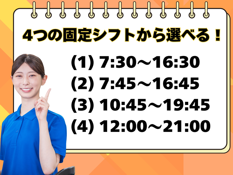 勤務時間 | 固定時間制 勤務時間詳細 ✨いずれも日勤のみ!夜勤なし✨ 勤務時間を以下4つから選べます! (1) 7:30~16:30(休憩1h) (2) 7:45~16:45(休憩1h) (3) 10:45~19:45(休憩1h) (4) 12:00~21:00(休憩1h) ※交代勤務ではなく、どれか固定シフトになります。 ※残業あり |