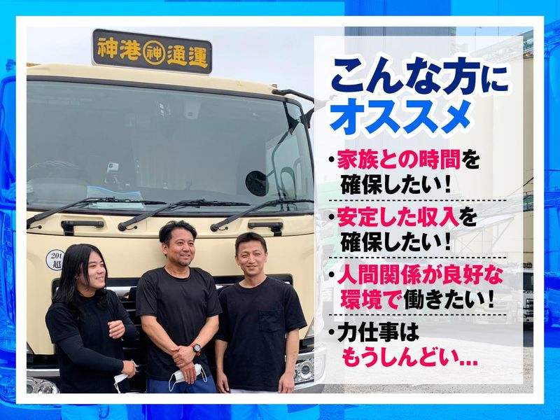 職種/仕事内容 | 仕事内容 「安定した仕事に就きたい」 「しっかり働いてしっかり稼ぎたい!」 「大型免許を活かしたい」 そんな方におすすめしたい弊社の特殊車両ドライバー! 元々大型の冷凍車ドライバーをしていましたが、 神港通運のバルク車に憧れて転職を決意。 総合物流会社として様々な仕事を請け負っているので、 安定感も決定打のひとつでした。 そんな神港通運をご紹介します。 【Q.1】バルク車ドライバーって何?  ̄ ̄V ̄ ̄ ̄ ̄ ̄ ̄ ̄ ̄ ̄ ̄ ̄ ̄ ̄ ̄ ̄ ̄ ̄ バルク車(粉粒体運搬車)という特殊車両で 大手製粉会社様の小麦粉を配送するお仕事です。 配送先は主に、製パン会社や製麺会社。 近距離の場合は1日2~3件程度、 中距離で1日1件程度の配送です。 タンク内の清掃業務(月3回程度) もあります。 ★宿泊を伴う運行はなし!毎日家に帰れます。 ★早出・宵積みもありますが、その分早く帰宅。 自分時間や家族との時間もしっかり確保できます◎ 【Q.2】バルク車ならではの魅力は?  ̄ ̄V ̄ ̄ ̄ ̄ ̄ ̄ ̄ ̄ ̄ ̄ ̄ ̄ ̄ ̄ ̄ ̄ ̄ 特殊車両を運転するのは中々ないことなので それもおもしろいですね。 車やバイク好きの方ならおもしろいと感じるはずです! 工場によって異なる機械を使って小麦粉の 積み下ろしを行うため、運転技術以外にも 求められることや覚えることは多いですが 力仕事が圧倒的に少ないのは大きな特徴です。 ★機械の操作さえ覚えればあとはラクラク! ★特殊車両ならではの操作を 完璧にこなせた時の達成感は格別です。 ★「初めは自信が無くても、やりこなせた!」 という瞬間が何度も訪れます。 【Q.3】一緒に働く人たちはどんな人たち?  ̄ ̄V ̄ ̄ ̄ ̄ ̄ ̄ ̄ ̄ ̄ ̄ ̄ ̄ ̄ ̄ ̄ ̄ ̄ 一言でいうと「職人さん」タイプ。 真面目でモクモクと働く方が多い。 長く働いている方が多いので、 何か教えてくれる時も要点抑えて 丁寧に教えてくれる◎ 「今日腰痛いねんー」など気軽に会話できる人も もちろんいますよ! 【Q.4】大型ドライバー未経験でも大丈夫?  ̄ ̄V ̄ ̄ ̄ ̄ ̄ ̄ ̄ ̄ ̄ ̄ ̄ ̄ ̄ ̄ ̄ ̄ ̄ もちろん大丈夫!最初は先輩が運転する トラックに同乗し、基本的な操作方法だけでなく お客様毎のルールや特徴など学べる時間を しっかり設けています。 ★研修期間は人によって異なります。 いち早く成長される方は 研修期間が短縮されることも◎ ★わからないことは何でも聞いてください。 あなたの成長を精一杯サポートします! 完璧になるには1年ほどかかりますが、 「素直に仕事に取り組む」姿勢が あれば大丈夫です。 気が長く、コツコツ頑張れる方なら 必ず活躍できます! - 【1日のスケジュール例】 4:00~5:00頃 出勤・点呼 ↓ 午前中 配送先へ出発 (兵庫県内・滋賀方面など) ↓ 昼頃 好きなタイミングで昼食 (お弁当やおにぎりを持参) ↓ 午後 納品完了後、翌日分を積込 ↓ 13:00~17:00頃 日報を書いて退社 ※運行スケジュールにより変動あり ※早出の分、早く帰宅できます! ※始発より前の出勤が多いです。 |