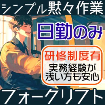 職種/仕事内容 | 仕事内容 仕事内容 食品関連の容器の資材を扱う倉庫で簡単作業! <具体的には> 業務は簡単! ・入出庫作業 ・ピッキング ・ラップ巻き など 会話少なめで黙々働きたい方歓迎! チームで動きますので、コミュニケーションを円滑に取れる 方も大歓迎 <おすすめポイント!> ■日勤のみ! ・マイカー通勤OK! ・資格不問! ・ブランクOK! <こんな方におススメです!> ・資格を活かして働きたい方 ・フォークリフト免許に興味がある方 ・製造工場や物流倉庫で配送準備・出荷作業・搬入搬出準備の経験がある方 ・リフトを使用した倉庫内作業・仕分け作業などの軽作業スタッフとしての経験がある方 ・カウンターフォークを主に使いますので、カウンターフォークに自信がある方 大歓迎! 【フォークリフト研修あり!】 フォークリフトの資格を活かして働きませんか? 「免許を取ったばかり」「まだ経験が浅い」といった方に、フォークリフトの研修を実施!(3~7日程度) 安心してお仕事をスタートできる環境です! ここがポイント シンプルかつ簡単なお仕事で未経験でも安心◎ 経験不問からスタートOK! すぐに覚えられる作業ばかりです! |