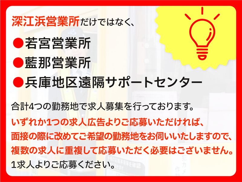 勤務地 | 深江浜営業所(阪神高速トール神戸株式会社) 658-0023兵庫県神戸市東灘区深江浜町57 |