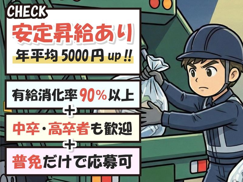 職種/仕事内容 | 仕事内容 Check============== ●学歴不問☆50歳以下の方限定募集 ●電話でのご応募大歓迎! ●残業なし!週平均実働39h ●有休消化率も90%超え! ================= 【仕事内容】 糟屋郡宇美町エリアの 可燃・不燃の家庭ごみ収集作業及び 収集車の運行業務(ルート集配)。 慣れたら運転業務もお任せします。 <仕事のポイント> ✅移動→収集→積下しの簡単3step ✅回収は指定ルートでシンプル ✅移動時間 > 収集時間で負担少 ✅3人1組のチーム作業で安心♪ ✅重量物や危険物の扱いもナシ! <仕事の流れ> 1.事務所に集合後、ルート確認など 2.指定のエリアへ移動して回収開始 3.パッカー車が一杯になったら処理場へ (上記を時間内に繰り返し行います) ※インフラを支えるために積雪等の 荒天時も原則稼働しています ・・・・・・・・・・・・・・・・・・・・・・・・・・・・・・・・・・・・・・・・ 【入社後の流れ】 先輩と収集車に乗り現場補助からスタート。 仕事に慣れて道順も覚えた6ヶ月目頃から 徐々に収集車の運転をお任せします。 運転を任されれば記載の給与とは別に 月5000~2万円程の手当を付与します。 (運転は毎回ではなく交替制) ・・・・・・・・・・・・・・・・・・・・・・・・・・・・・・・・・・・・・・・・ 【経験不問でどなたも歓迎】 ✅業界・職種ともに未経験でもOK ✅第二新卒で求職中の方歓迎 ✅Uターン・Iターンも歓迎 ✅学歴不問!中卒・高卒もOK |