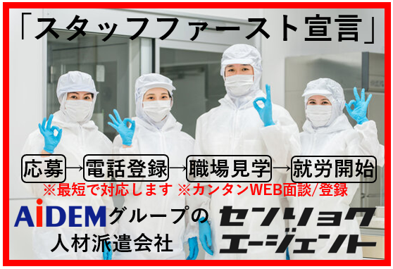 その他 | 備考 戦力エージェントは日曜日の折込求人広告アイデムのグループ会社です。 派遣で働いたことがないから不安・・・、 派遣で嫌な思いをしたことがある・・・ などなど、 新しいお仕事を始める時は誰でも不安なもの。。。 でも戦力エージェントでは!!! ご登録から就労開始後のフォローまで一人の担当がサポート致します! スタッフの皆様に安心してお仕事して頂けるよう、 私たちが全力でサポート致しますので、 派遣デビュー、派遣スタートは私たちにお任せください! 当社HPにてカンタンにWEB登録ができます。http://www.senage.co.jp/ |