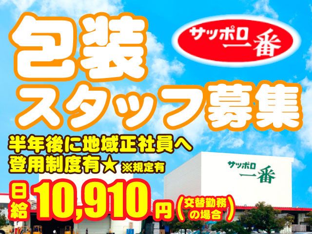 その他 | 職種補足 【包装スタッフ/ライン作業】サッポロ一番 みそラーメン等の即席麺製造工程における包装作業 雇用形態 契約社員 学歴 不問 備考 採用に関するお問い合わせは 下記までお気軽にご連絡ください。 太平食品工業株式会社 本社工場 〒371-0811 群馬県前橋市朝倉町555-4 TEL:027-220-3492(採用担当まで) 社会保険 健康保険あり,厚生年金あり,雇用保険あり,労災保険あり 試用期間 あり 日給10,910円 試用期間2週間有(給与同額) 喫煙環境 屋内禁煙(喫煙所あり) 担当者 採用担当 受付先名 太平食品工業株式会社 本社工場 〒371-0811 群馬県前橋市朝倉町555-4 TEL:027-220-3492 |