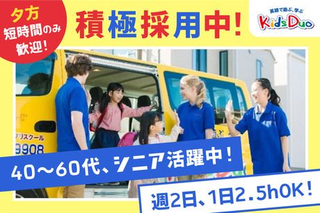 職種/仕事内容 | 仕事内容 子どもたちの笑顔が癒しの瞬間! Kids Duoの送迎バスの添乗員として 子どもたちの乗り降りのサポートや シートベルトの確認等をお任せ。 ・車種:ワンボックスカー ・乗車人数:1回で最大7名 ・エリア:近くの小学校/スクール/自宅付近 「ハロー!」と元気に挨拶してくれる子どもたちの笑顔に癒されながら働けます♪ 子供に関わる仕事がしたい方歓迎! 【電話相談・応募受付もしております!】 お気軽にお問い合わせください♪ TEL: 0800-100-6935 午後のみサクッと働けます♪家庭やプライベートとの両立ラクラク♪ 家庭や育児との両立応援! 平日夕方~夜の短時間からOK! (通し勤務できる方も募集中◎) 週2日~OKで、土日・祝日の勤務はありません。 お仕事復帰にもおススメ! 授業がない曜日や授業終わりに近所で働く学生さんも活躍中! 旅行やプライベートな用事とも両立可能! 午後or夕方スタートだから午前はゆっくり! お仕事は14:00or17:30スタートだから 午前はゆっくりできますよ♪ 家事を終わらせてからお仕事もOK! 週2日~だからプライベートな用事との両立もしやすいんです! 学生さんや久しぶりに働くママさん、 扶養内で働く主婦さん、ブランクがある方、 60代以上のシニアの方などが活躍中です♪ <<求人が気になりましたら保存をクリック!>> |