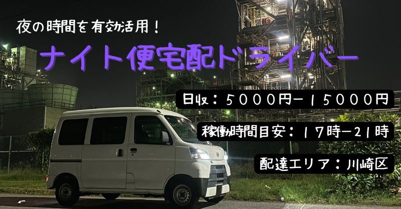 アピールポイント: ✔完全出来高制 報酬は配達した個数に応じて決まる完全出来高制。配達すればするほど報酬に直結するため、上限なく稼げるのが最大の魅力です!実際に月収40万〜60万のドライバーが多く、中には月収100万を超える方も在籍しています。日々の努力がそのまま報酬につながるので、やる気次第で高収入を目指せます✨ ✔未経験歓迎 最初はできないのが当たり前です。初めのうちは不安なことも多いと思いますが、独り立ちできるまで会社全体でしっかりサポートします!何度でも丁寧にお伝えしますので、未経験の方でもご安心ください。早ければ3日、遅くても1週間ほどで独り立ち可能です。 ✔ 必要なのは普通免許のみ お仕事を始めるにあたり、初期費用は一切不要!普通自動車免許があれば、経験がない方や車をお持ちでない方でも明日からスタートできます。 ✔ライフスタイルに合わせて選べる働き方 副業・Wワークも可能で、本業や他の仕事と両立しながら働けます。出勤日や休みの日は自由に調整でき、夜だけの配達(ナイト便)も選択可能です。自分のライフスタイルに合わせて無理なく働ける環境です。 ✔自分のペースで働ける自由な環境 配達中は基本的に1人作業のため、人間関係のストレスは少なめです。配送ルートや休憩時間も自分で調整できるため、自分のペースでお仕事ができます✨