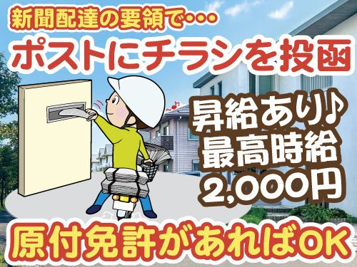 職種/仕事内容 | 仕事内容 バイクは会社から貸与!バイクの持ち込み・貸出もOK! 原付免許があれば気軽にスタートできる 自社チラシの投函スタッフ(パート・アルバイト)の募集です。 【自社案内チラシのポスティング】 港南区のオフィスに出社し、 配布物を受取・積み込み ↓ 担当地域に移動し、 住宅ポストにチラシを投函 (スクータータイプのバイクを運転します) ↓ チラシ残部を会社に持ち帰り報告して業務終了! 新聞配達の要領で当社の案内チラシをポスト投函していきます。 バイクに乗れる方なら全くの未経験でも大丈夫です。 もちろん元新聞配達・宅配・配達経験者の方も歓迎。 一人作業でマイペースに働きたい方におすすめです。 投函エリアは横浜市鶴見区他周辺となります。 【インセンティブ別途支給】 当社の案内チラシをご覧になった方からの問い合わせ・反響があった場合インセンティブの支給があります。 【副業・Wワークにもおすすめ】 週3日~勤務OK!週5日できる方大歓迎! 家計の足しに無理なく働きたい方も、レギュラーワークで週5日しっかり働きたい方も歓迎します! 主婦(夫)・シニア・学生など幅広い世代が活躍しています。 ご応募やご質問はTELでも受付しております。 090-2909-6080(採用担当) まずはお気軽にお問い合わせください。 |