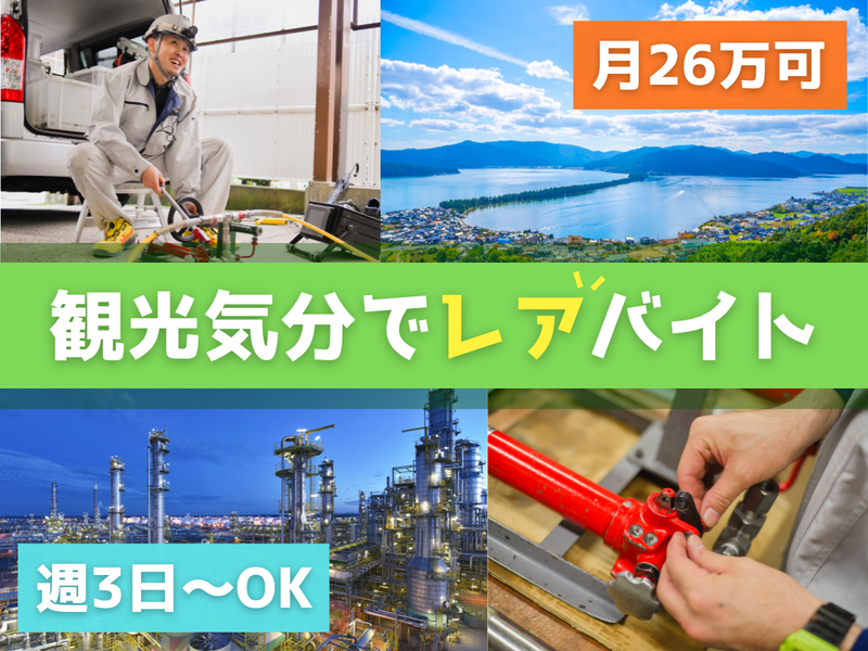 職種/仕事内容 | 仕事内容 《 ここがポイント! 》 ●オープニングスタッフ募集! ●未経験歓迎!運転できればOK! ●月収26万円以上の高収入可能! ●旅先でお仕事後は観光もOK♪ ●学生さん&フリーターさん大歓迎! ●正社員登用も目指せます!! シフトは週3日~OK! 関東をメインに地方をめぐる 旅する工場スタッフを募集します♪ ―――――――――――――― 《 仕事内容 》 色んなエリアの工場に伺って、 設備の検査を行うお仕事です! 工場までの運転や先輩スタッフの 検査サポートなどを行います♪ ・ドライバー業務(運転) ・積み込みサポート ・検査サポート マニュアル通りの作業が中心で、 未経験でも安心して取り組めます♪ 機材の運搬などもあるため、 男性スタッフ中心の職場です! ―――――――――――――― 《 具体的には… 》 各地の工場ではかり(計量器)の 検査業務を行っていきます。 検査は1件あたり約1~2時間で、 社用車を使って工場に向かいます。 移動中も時給を支給するほか、 現地で時間が余ったら観光もOK! 「会社に戻るまでの運転もお仕事」なので、 その間の時給もちゃんと支給します♪ ―――――――――――――― 《 旅先は… 》 基本は神奈川、千葉、茨城、栃木、 群馬などの関東エリアが中心です。 東北や関西、離島への訪問もあり! 空いた時間は観光や温泉も楽しめます♪ ―――――――――――――― 《 ポイントは… 》 入社後は丁寧な教育研修があり、 【基本的な業務の進め方】から 【機材の使い方やマニュアルの見方】 【気を付けた方が良い点】まで 先輩がしっかりと教えてくれます! ゆくゆくは正社員を目指す道もあり。 ●まだやりたいことが決まっていなくて じっくりと適職を見極めたい ●色んな地方に行ってみたい ●手に職がつく仕事を探したい など、今はまだ考えていないけど、 ゆくゆくは正社員を見据えている、 という方にもぴったりの仕事です。 ―――――――――――――― 《 ちなみに… 》 ある程度単位の取得の目途がついていて、 まだ就職先が決まっていない… という専門学生・大学生も大歓迎! まずはアルバイトから始めてみて、 自分に合う仕事か検討したり、 色んな地域に行って見聞を深めて、 本当にやりたい仕事を探したりと、 あなたらしい就活を応援します! ★当社なら「計量士」という超専門的な資格も取れるので、手に職をつけたい方にオススメです♪ ―――――――――――――― 《 シフトは… 》 週3日~OKで曜日の希望も相談OK。 勤務時間は7:00~19:00の間で 1日8時間の勤務を予定しています。 シフトは月1回のサイクルで決定。 事前に予定をヒアリングした上で、 毎月のシフトを決定していきます。 フルタイムで働いてくれた月は 月収26万以上の高月収が可能!! 高収入を目指す方にも最適です♪ ―――――――――――――― 《 当社について 》 みなさんは「計量」という言葉を 聞いたことがありますか? 「計量カップ」「計量器」など、 なんとなく子どもの頃から名前は 知っているジャンルだと思います。 当社はその「計量器(はかり)」が 正確に計れる状態かを検査する 検査業務を行っている会社です。 主にビルや道路、橋などに使われる 建材を生産している生コン工場に伺い、 はかりの検査を行っています。 関東ではわずか66社しか この事業をやっていないので、 実質“当社でしかできないような” 超激レアなアルバイトです♪ |