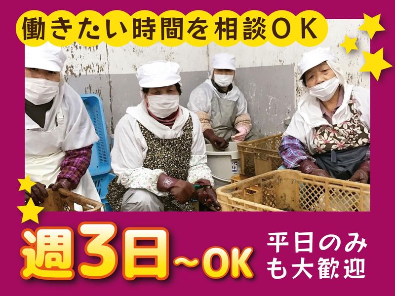 職種/仕事内容 | 仕事内容 \午前・午後だけもOK!週3日~相談可/ *20代~40代主婦さんや60代シニアさん活躍中* 「11月20日頃~来年4月末頃」の短期間、 サツマイモを扱うカンタン作業に挑戦! みんなで美味しい干し芋を作りましょう! *------------------* 【 仕事内容 】 ・サツマイモの皮むき ・サツマイモのスライス ・サツマイモを網に並べる ・パッケージング、 ・ラベリング ・梱包などの出荷前作業 など誰でもできるカンタン作業! 出来る方は、伝票発行・オンラインでの発注対応等も お任せします。 *------------------* 【 働く期間 】 11月20日頃~来年4月末頃 ※業務により期間延長あり ※期間終了後も希望により継続勤務可能 *------------------* |