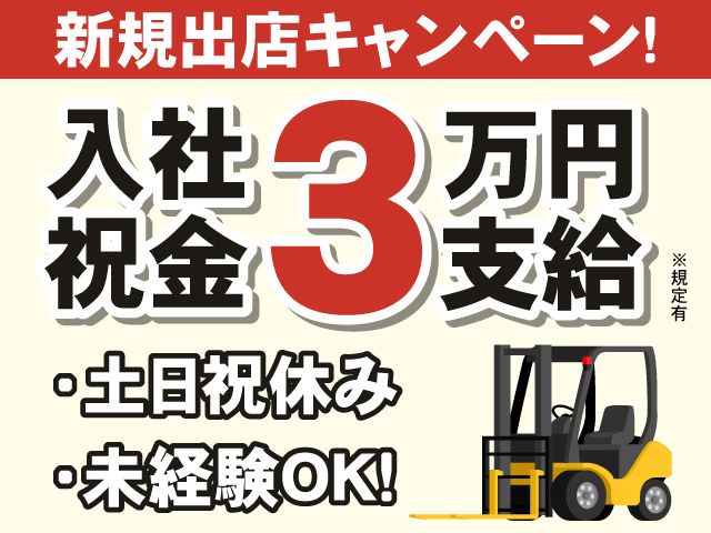 職種/仕事内容 | 仕事内容 新規事務所開設にあたり 応募・面接でQUOカード500円 プレゼントキャンペーン実施中 ※規定有 <ポイント> ・新規出店キャンペーンにつき入社祝金3万円支給!※規定有 ・給与前渡し制度あり(規定有) ・人気の土日祝休み ・日勤or夜勤選べます <お仕事詳細> 食品工場の倉庫内でフォークリフト業務です。 材料のピッキング業務もしていただきます。 食品を扱うため、クリーンスーツを着用しての作業です。 10代~50代まで、幅広い年代の男性が活躍中の職場です。 <未経験OK> フォークリフト免許をお持ちであれば、未経験でも応募OK! しっかりと教育致しますので安心して働くことができます。 <給与前渡し制度あり> 上限10万円までOK! 急な出費でお財布がピンチの時も安心のシステムです。 |
