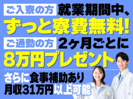 ★寮費無料または2ヶ月ごとに8万円の祝金支給あり★食事補助あり◎月収31万円以上可能×土日休み!