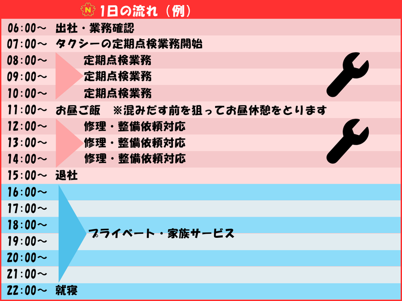 職種/仕事内容 | 仕事内容 / 車検を自社工場内で実施できる 指定工場です! \ =================== ✨求人のポイント✨ ~~~~~~~~~~~~~~~~~~~ ✅月収は最低30.5万円 (50代の平均年俸は570万円) ✅勤務終了時間は15:00 or16:00 ✅年間休日は121日以上 ✅接客・営業要素なし ~~~~~~~~~~~~~~~~~~~ ■□■□■□■□■□■□■ ✨資格があれば経験不問!✨ 自社タクシー専門の整備士募集 ・:・:・:・:・:・:・:・:・:・:・:・:・:・:・ 営業所に隣接する整備場にて 自社タクシーの整備業務を お任せします。 整備士2級の資格さえあれば 未経験の方も大歓迎です! ■□■□■□■□■□■□■ ✅完全週休2日制! ✅平均勤続22.5年! ✅残業少なめ! ✅ノルマなし! ▽タクシー・ハイヤー業界の最大手▽ ・:・:・:・:・:・:・:・:・:・:・:・:・:・:・:・:・:・:・ 東京を中心に、首都圏、関西圏各地で 約1万台のハイヤー・タクシーが 運行しています。 ドライバーさんが毎日安心して 運転できる環境を一緒に作りましょう。 ▽キャリアアップが可能▽ ・:・:・:・:・:・:・:・:・:・:・:・:・:・:・:・:・:・:・ 未経験の方も、 一般整備士からスタートし、 チーフ、工場長へと キャリアアップすることができます。 ◦⊹⋯⋯⋯⋯⋯⋯⋯⋯⊹◦ 【年代別平均給与】 ✬ 20代:411万円 ✬ 30代:457万円 ✬ 40代:533万円 ✬ 50代:570万円 ◦⊹⋯⋯⋯⋯⋯⋯⋯⋯⊹◦ ▽対象車種が決まってます!▽ ・:・:・:・:・:・:・:・:・:・:・:・:・:・:・:・:・:・:・ 現在営業所に保有している車が 5~6種類程度。 車種が決まっているので 整備もスムーズに行えます。 【取扱車種例】 トヨタ ジャパンタクシー トヨタ プリウスアルファ トヨタ クラウン トヨタ エスクァイア トヨタ アルファード トヨタ レクサスLS 等 ※後々水素自動車や自動運転車の 整備・点検業務をお任せする 可能性があります※ ー【具体的な仕事内容】ー ★自社タクシーの整備スタッフ★ ・:・:・:・:・:・:・:・:・:・:・:・:・:・:・:・ 法定点検⏩エンジンオイルや タイヤの交換など 決められた項目の点検・整備 車検点検⏩指定項目の点検・検査(1年おき) 臨時整備⏩故障診断機を使っての交換作業など 特殊改造⏩リアルHV車両への改造 新車装備⏩料金メータや行灯、 外装社名ステッカーなどの貼り付け ラッピング⏩車体への広告シートの貼り付け などの、業務をお任せします。 ┎┈┈┈┈┈┈┈┈┈┈┈┈┈┈┒ ✨先輩スタッフからのメッセージ (50代・男性)(*'◇') ┖┈┈/┈┈┈┈┈┈┈┈┈┈┈┚ 長く安定して働きたいと思いながらも、 以前は給与のために残業続きの日々。 働いた分だけやりがいもありましたが、 年齢的にも少し負荷を減らしたいと 感じて転職しました。 これまでずっと整備士として やってきましたが、 タクシーの整備は一般車両よりも 摩耗が進んでいて、 整備のしがいがあります。 さらに、自動運転車や水素自動車など 新しい技術にも関われるので、 今もワクワクが止まりません! 「最後の転職先」として、 本当にベストな選択だったと思っています。 <⌛1日の流れ⌛> ✅パターン1 ▼6:00~ 出社、業務確認 ▼7:00~ タクシーの定期点検業務開始 ▼8:00~ 定期点検業務 ▼11:00~ お昼ご飯 混みだす前を狙って お昼休憩を取ります! ▼12:00~ 修理・整備依頼対応 ▼14:00~ 事務処理・残務対応 ▼15:00 退社 ✅パターン2 ▼7:00~ 出社、業務確認 ▼8:00~ タクシーの定期点検業務開始 ▼9:00~ 定期点検業務 ▼11:00~ お昼ご飯 混みだす前を狙って お昼休憩を取ります! ▼12:00~ 定期点検業務 ▼15:00~ 事務処理 ▼16:00 退社 |