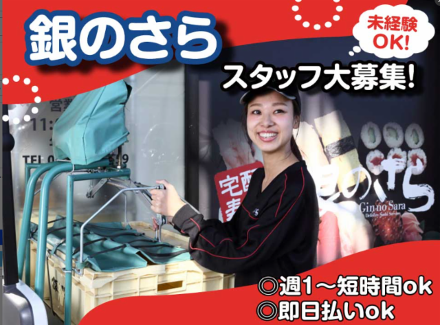 職種/仕事内容 | 仕事情報 ● 仕事内容 大手宅配チェーンの「銀のさら」のデリバリーのお仕事!配達目 安は1時間に2~3件。配達のない時間帯はお箸セット作成、店 内作業補助、洗い物などの簡単な調理補助をお願いします。未経 験者歓迎!バイクは三輪&屋根付きで雨の日も安心。ナビ連動の 専用アプリがあるので道に詳しくなくても安心スタート! 私生活優先でお仕事できる 「家事と両立してお仕事したい」 「私生活を優先してお小遣い稼ぎしたい」 「Wワークで効率よく稼ぎたい」 「扶養内でスキマ時間を有効活用」 →そんなあなたにもピッタリ! 学生さんのテスト期間中のシフト調整や 急なお子様の体調不良についても お気軽に相談下さい! 面接で多い質問にお答え! Q:バイクの運転経験は必要ですか? A:経験は関係なく免許を持っていればok! 先輩にもこれまでほとんど 運転していなかった方も多くいます! Q:大変な事ってありますか? A:悪天候の際は運転に 気を付けなくてはいけないところです。 しかし銀のさらでは三輪&屋根付きバイクで 天候に関わらず安全にお仕事して頂けます! お仕事のメリットTOP5! 【No.1】 一人でコツコツ&たんたんと気楽に働ける! 【No.2】 ほどよく体を動かしながらお仕事できる! 【No.3】 知らない道を知れたり、いろんな場所に行ける! 【No.4】 お客様にありがとうを言ってもらえてうれしい! 【No.5】 覚えることが少ないので始めやすい! 初バイトでも大丈夫! 「困ったときはお互い様」それが当たり前の当社。 分からないことがあれば、フレンドリーな先輩が丁寧にお教えします! 仕事のことはもちろん、私生活のことも相談できるくらい 仲のいいスタッフ…一生モノの大切な仲間と出会えるかも!? |