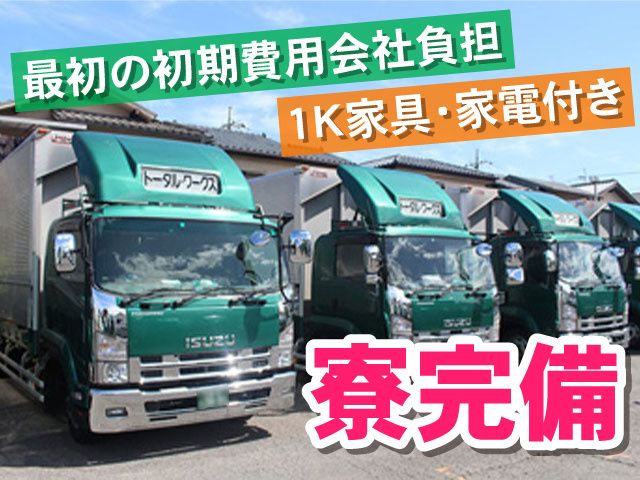 職種/仕事内容 | 仕事内容 【寮完備】遠方からのご応募もOKです 1K家具・家電付き!最初の初期費用会社負担! <注目ポイント> 〇13時半に終了 〇週休制(日曜固定休み) 〇1Kの寮完備 〇中高年活躍中 〇ブランクOK <必須資格> 中型自動車第一種運転免許 ※入社後に中型免許の取得も可能です 【主な仕事内容】 4tトラックでの配送ドライバー 通販家具を配送するお仕事です。 [積み地]吉川市・坂戸市の物流センター [卸し地]所沢市・越谷市の倉庫 物流センターからハブセンターに卸すお仕事です。 最初に同乗研修があるので未経験者も安心です。 (経験度によって研修期間は変わります) ルートを覚えたらすぐに独り立ちできますよ! 全車にデジタルタコグラフ、バックカメラ、ETCを搭載! <こんな方にオススメ> 〇中型トラックドライバー正社員の経験者 〇未経験からドライバーに挑戦したい 〇午後は自由な時間にしたい 〇寮・社宅完備の仕事を探している 〇ブランク・経験浅い方 【勤務について】 早朝~午前便、日曜固定休み 休み希望についてはお気軽にご相談ください! <資格取得支援制度あり> 中型免許をお持ちでない方でも安心! 会社負担で免許の取得が可能 免許取得後、約2週間~1ヵ月かけて配送ノウハウを学べます 未経験からスタートした方、30代・40代の中高年活躍中! 配送ドライバー・軽貨物ドライバー・トラック運転手など ドライバーの経験がある方も大歓迎! 経験は正社員・アルバイト・パートなど問いません。 寮・社宅完備で生活基盤を整えたい方にもオススメ 一人暮らししたい方にもピッタリな1Kの家具・家電付き! 遠方からの応募OK!転職後すぐに新生活が始められます。 ▼詳細はHPからご覧ください http://www.total-works.co.jp/corporate/ ご質問などお気軽にお問い合わせください。 TEL.048-864-1395 |