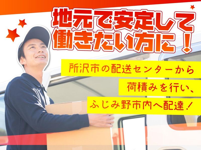 職種/仕事内容 | 仕事内容 朝、埼玉県所沢市にある 大手荷主様配送センターへ直行後、 荷積みを行い、ふじみ野市内を配達します。 企業配達が多いので留守の心配が少なく、 無駄なく、効率よく配達が出来ます♪ 全ての配達が終わりましたら センターへ戻り、簡単な事務処理を 済ませた後帰宅となります! 【他にも埼玉県内勤務地多数あり】 ミドル世代応援企業‼  ̄ ̄V ̄ ̄ ̄ ̄ ̄ ̄ ̄ ̄ ̄ ̄ ̄ ̄ ̄☆* 【⭐POINT⭐】 ▷基本:直行直帰 ▷「地元で安定して働きたいな」 という方にもピッタリ ▷若手・ミドル(中堅)・シニア活躍中! ▷年代関係なしに働けるのが この仕事のいいところ♪ |