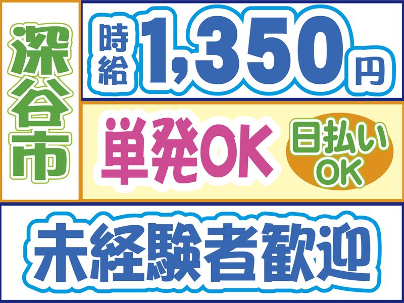 職種/仕事内容 | 仕事内容 カンタン作業で高時給案件 人気のお仕事なのでご応募はお早めに! 「箱詰めスタッフのポイント」 〇未経験・ブランクOK 〇高時給1,350円スタート 〇日勤のみ 〇週1日~勤務OK(単発可) 〇土日祝休み(週休2日制) 〇20代30代40代50代の男女活躍中 〇私服勤務OK!(服装自由) 〇髪型・髪色自由(派手過ぎなければOK) 〇扶養内・WワークOK 〇日払いOK(規定内) 〇履歴書不要 〇交通費支給(規定内) 〇「マイリク定着支援」導入企業! 「箱詰め・荷積みの仕事について」 深谷市にある洗剤などを 製造する企業様でのお仕事です。 今回お任せするお仕事は… 液体洗剤の容器を機械にセットしたり、 出てきた容器を検品して箱に詰めたり。 その他、簡単な荷積み作業を お願いすることもあります。 動きやすい服装でOK! 工場での経験がなくても大丈夫 初めての方でも丁寧に教えてもらえるので安心です。 「箱詰め・荷積みの勤務について」 週1日~5日で勤務OKです! 単発でのお仕事も可能なので ご自身の都合に合わせて働けます。 〇日勤のみ・8:30~17:30 (実働8時間)※休憩60分 〇週1日~勤務OK(単発可) 〇土日祝休み(週休2日制) 急な発熱・体調不良・冠婚葬祭など、 突発的なお休みに柔軟に対応しております。 「こんな経験活かせます!」 特別な経験・資格は 必要ありませんのでご安心ください。 下記経験者は前職活かせます。 〇ピッキングパート・アルバイト 〇軽作業パート・アルバイト 〇仕分けパート・アルバイト 〇倉庫内派遣 前職不問で採用しております。 ご不明な点はお気軽にお問い合わせください。 お電話でのご応募、ご質問も受付中! 株式会社ロフティー 熊谷支店 担当営業、または採用担当まで TEL0800-222-6888(フリーダイヤル) お仕事情報などはこちら https://entori.jp/lofty-saitama コーディネーター・定着支援のWサポート体制導入 「マイリク定着支援」導入企業! アンケートで職場の様子を確認し、 コーディネーター・定着支援担当が連携してサポート。 はじめての派遣でも安心して働けるよう迅速かつ 丁寧にサポート対応いたします。 |