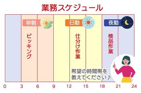 勤務時間 | シフト制 勤務時間 ・勤務時間: [1] 23:00~05:00 [2] 24:00~05:00 [3] 24:00~09:00 ・最低勤務日数(週):3日 ■ 土日祝休み/シフト制/固定休 365日動いている倉庫なので働きやすさを考えて休みも選べるように設定しました! 通院や習い事で固定勤務で働きたい~家族と予定が合う土日祝休みがいいな~という方も♪ お子さんの体調不良による急なお休みも柔軟に対応します◎ 勤務日数 ▼希望の日数をお選びください。 ・週3日 ・週4日 ・週5日 ※週16時間以上でシフトを調整させて頂きます。 ▼ご希望の時間をお選び頂けます。 例えば、、、 ・ 23:00~05:00 ・ 24:00~05:00 ・ 24:00~09:00 ※実働4h~から就業可!その他の時間帯もご相談ください。日によって勤務時間の変更も可能です◎ |