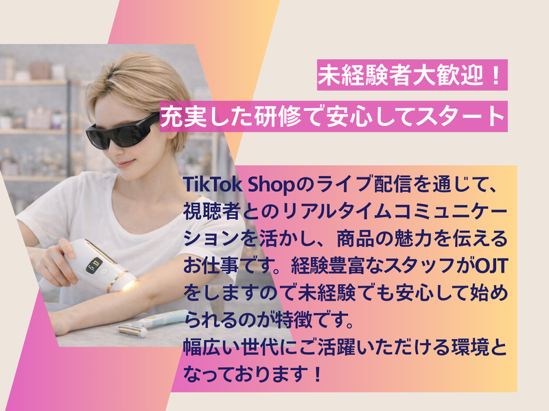 職種/仕事内容 | 仕事内容 TikTok Shopで“売れる場”をつくる仕事 ■ ポジション概要 ✅TikTok Shopのライブ配信を通じて、視聴者とのリアルタイムコミュニケーションを活かし、商品の魅力を伝えるお仕事です。 ✅ただ商品を紹介するのではなく、その場の空気を読み、コメントを拾い、購買意欲を高める。 ✅「配信 × 販売」のスキルが身につく実践型ポジションです。 ✅ノルマなし!歩合制などではないので、働いた分だけ必ずお給料がもらえます。 弊社は代理店となりますので、様々なクライアント様のTikTokLIVEに出演していただきます。 希望商材の専任や、多岐に渡ってご活躍いただける方、どちらでもOKです! 幅広い世代にご活躍いただける環境です。 ■ 業務内容 ✅ライブ配信での商品の実演、紹介 ✅視聴者とのコミュニケーション ✅コメントを踏まえたトーク展開 ✅配信前の内容確認、構成すり合わせ ✅(希望制)短尺動画の収録協力 商材はコスメ、美容家電、日用品、食品、アパレルなど幅広く展開。 得意分野や適性を考慮して担当クライアントを決定いたします! ■ この仕事で得られるもの ✅ライブコマースの実務経験 ✅販売スキルの向上 ✅数字を意識したトーク力 ✅SNS時代のマーケティング感覚 ✅クリエイターとしての活動領域の拡大 視聴数や売上など、成果は明確に可視化されます。 結果が数字で見えるからこそ、成長実感も大きい環境です。 ■ サポート体制 ✅配信台本の用意 ✅機材サポート ✅運営チームによるフォロー 経験豊富なスタッフからのOJTからスタート。 未経験の方も段階的にスキルを習得できます。 ■ 応募条件 ✅週2日以上稼働可能な方 ✅1日2時間以上勤務できる方 ■ 勤務時間 6:00〜23:00の間でシフト相談可能 短時間勤務、フルタイムいずれも歓迎 ■ その他 ✅清潔感があれば服装、髪色、ネイル、ピアスは問いません ✅髭やタトゥーもOK(タトゥーは配信中に隠せられればOK) ■ 給与詳細 時給2,000円~ ■ 選考プロセス ▼Webエントリー ▼エントリー内容による書類選考 ▼面接(一次:Web/二次:ご来社) ▼内定 ポイント:事前体験制度あり 「できるかわからない」と不安を持たれている方は、数日だけお仕事を体験していただけます。 (もちろんその分はお支払いをいたします) ■ 企業名 ジャグー株式会社 ■ アクセス ・西武有楽町線新富町駅 ・八丁堀駅や宝町駅からも近い距離です ■ 代表社名 米原広兼 ■ 代表電話番号 03-6275-2995 |