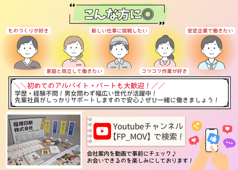 選考プロセス | 選考プロセス 【募集背景】 ありがたいことに、近年お仕事のご依頼が増えており、体制強化のため新しい仲間を募集することになりました。 福博印刷は、スタッフ一人ひとりが無理なく働ける職場づくりを大切にしています! 【入社までの流れ】 応募→書類選考→面接(1回)→内定 ※面接では職場見学を兼ねた面談を行います |