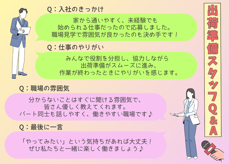職種/仕事内容 | 仕事内容 ✨佐賀から全国へ✨ 【梱包・検品・出荷準備スタッフ】 ✅福博印刷とは? 『情報の価値を追求する』という企業理念のもと、お客様の課題や目的を共有し、解決に向けて共に歩むプロモーションコンサルティング企業です! クリエイティブデザイン、マーケティング・ブランディング、映像制作、Web・ICT分野など印刷を中核に、幅広いサービスを展開しています! 私たちが働く『九州プリンティングセンター』は、西日本でも有数の印刷生産工場!“情報をカタチにして発信する”ことで、地域に貢献しています! ✅福博印刷で働く魅力! ✨未経験OK!パートデビューの方も大歓迎! ✨週4日/6時間〜勤務OK!家庭との両立も◎ ✨佐賀から全国へ!製品を届けるやりがいのあるお仕事! ✨作業は丁寧にレクチャー!未経験でも安心してスタート可能♪ ✨昇給あり!頑張りはしっかり評価します◎ ✨コツコツ作業が中心!自分のペースで働けます! ✨創業77年の安定企業!安心して長く働ける環境です! ✨マイカー通勤可能!無料駐車場あり! ✨職場見学OK!雰囲気を見てから応募可能! ⏰公式インスタグラムも公開中⏰ 『福博印刷株式会社』or『2989_prt』で検索☆ 社員インタビューなども投稿予定✨ ぜひご覧ください♪ ✅仕事内容 印刷された製品の梱包・検品・出荷準備を行うお仕事です。 作業は分担制なので、未経験の方も安心してスタートできます♪ ≪具体的には≫ ■製品の検品(色ムラや不備がないかチェック) ■製品の包装、箱詰め作業 ■出荷準備(送り状の作成 ※簡単なPC操作あり) ■製本や断裁などの補助作業 など **未経験でも安心!** 特別な経験や知識は一切不要✨ 作業は先輩スタッフが丁寧に教えるので、 完全未経験の方も安心して始められます! ✅働くパートさんへインタビュー! ≪入社2年目/Yさん≫ Q:入社のきっかけ A:家から通いやすく、未経験でも始められる仕事だったので応募しました。職場見学で雰囲気が良かったのも決め手です! Q:仕事のやりがい A:チームで役割を分担しながら作業を進め、出荷準備がスムーズに終わったときに達成感を感じます。 みんなで協力して一つの流れを支えている実感が持てるところが、この仕事のやりがいです! Q:大変なこと A:出荷量が多い日は忙しく感じることもありますが、周りと声を掛け合いながら進められるので、一人で抱え込むことはありません。 無理のないペースで働けています! Q:職場の雰囲気 A:分からないことはすぐに聞ける雰囲気で、皆さん優しく教えてくれます。パート同士も話しやすく、働きやすい職場です♪ Q:最後に一言 A:未経験からスタートした私でも、今では安心して働けています。 「やってみたい」という気持ちがあれば大丈夫!ぜひ私たちと一緒に楽しく働きましょう♪ |