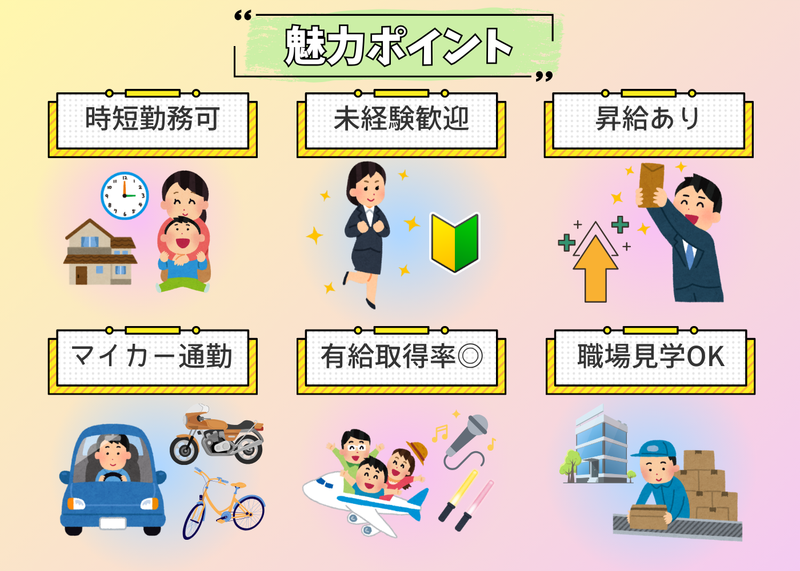 対象となる方 | 求めている人材 \未経験歓迎!学歴・職歴不問!/ 高卒・第二新卒・社会人デビューも大歓迎! 実際に、未経験から入社した先輩たちもたくさん活躍中です! ≪こんな方に◎≫ ◆コツコツ・丁寧な作業が好きな方 ◆決められた手順で進める仕事が得意な方 ◆チームで協力しながら働くのが好きな方 ◆安定した環境で長く働きたい方 ◆未経験から新しい仕事にチャレンジしたい方 ◆扶養内や家庭と両立しながら働きたい方 まずは気軽にお話ししましょう!ご応募お待ちしております✨ |