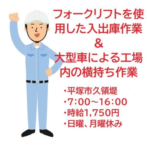 職種/仕事内容 | 募集要項 職種 高収入 フォークリフト入出庫作業 平塚市(大型車による工場内の横持ち作業あり) 平日休み 雇用形態 派遣社員 仕事内容 工場でのフォークリフト操作及び工場内、大型車での横持ち作業 鋼材メーカ工場での、フォークリフト作業及び大型車での工場内、横持ち作業。 フォークリフトにて、入出庫作業。 工場内、物品の移動。 生産付随業務起因物の定位間の運搬・移動など。 また、工場内を大型トラックに乗って工場内の荷物の横持ち作業をお願い致します。 横持ち作業の頻度は少なめフォークリフト作業がメインとなります。 始業時間早めスタート、残業ほとんどなし。 |