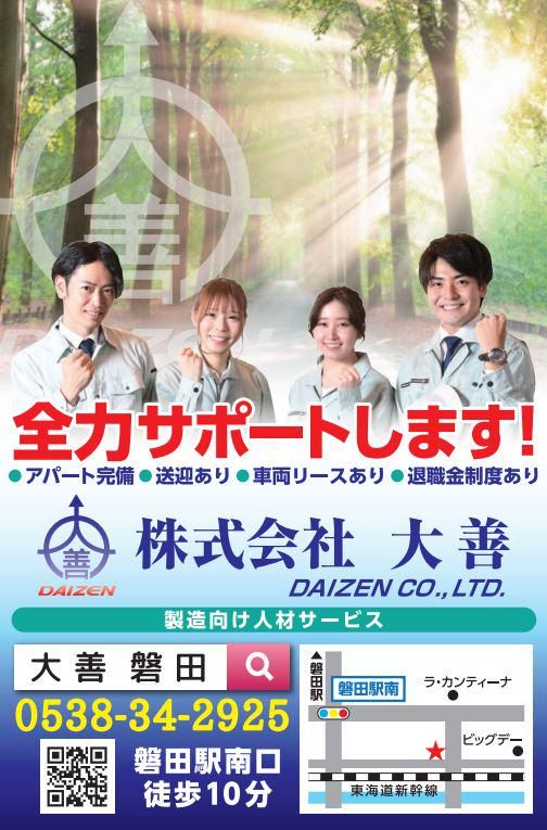 職種/仕事内容 | 仕事内容 <勤務地について> 住所は磐田市ですが浜北大橋の近くです! 磐田エリア・浜北エリアどちらからも通いやすい♪ - <アピールポイント> ▶初心者歓迎!簡単作業♪ 複雑な作業はなし 先輩も全員が【未経験】からのスタート◎ ▶バランスの取れた働き方 日勤×土日休み×長期休暇あり プライベートも大切にできます♪ ▶人物重視で選考、全員にチャンス 経験不問で、人柄を重視! 入社後もサポート充実で安心★ ▶「正社員」へをめざす人に"も" 正社員登用の実績多数♪ ▶驚きの高待遇とサポート 大善はスタッフを大切にする会社です! 〇入社祝い金orお友達紹介金5万円 〇寮あり 〇退職金制度有 気になることはなんでもご質問ください!! - <仕事内容> 車のバンパー・ボートのエンジンカバーのバリ取り・検査をお任せします! 個人作業台でのコツモク作業です♪ ☆バリ取りとは??☆ 樹脂や金属の加工時に発生する端っこの不要なギザギザを研磨し除去する作業のことです! 難しい作業ではないので未経験からスタートしやすい人気のお仕事! 作業はカンタン2ステップ♪ 1.台車から製品を作業台へ移す プラスチック・アルミ製品だから重くありません! 2.目視検査をし、 バリやキズ等があれば研磨や修正をする! ライン作業ではないので、 自分のペースで進められます♪ 慣れてきたら別の業務も少しずつお任せするので 飽きずに続けていけます! いずれもカンタン作業なので 未経験の方にも安心なお仕事です♪ =========大善の紹介========= 【未経験から始められる理想のお仕事を】 大善が全力でお探しします 業界トップクラスの多様性を誇る私たちの取り扱い業種は、 自動車、電子製品、食品製造の工場を中心とした製造業です あなたの【長く安定してはたらきたい】気持ちを応援します ※未経験から正社員を目指せる案件もありますよ♪ 初めての派遣で不安な方もご安心ください 一人ひとりに合わせた丁寧にサポート♪ 派遣デビューを全力でバックアップします♪ 未経験から始めるあなたを【全力で支援】します! これからのキャリアを一緒に築きませんか? あなたからのご応募を心よりお待ちしております。 ======================== |
