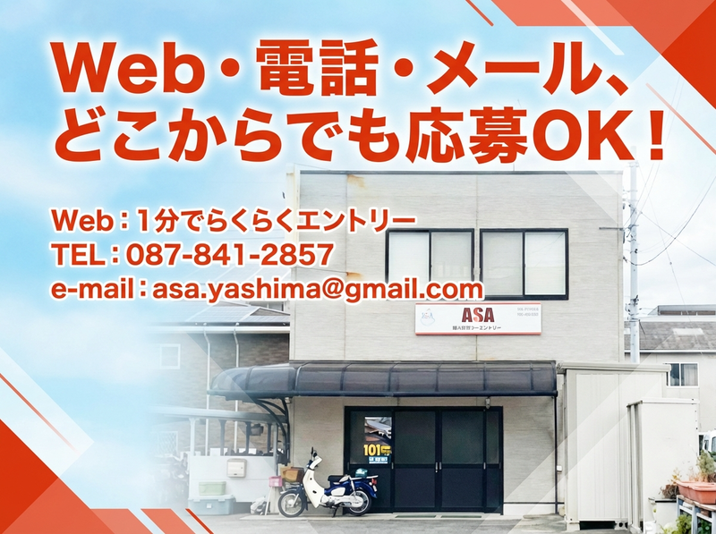 選考プロセス | 選考プロセス 《 約1分でらくらくエントリー 》 応募時の履歴書・職務経歴書は不要! 基本情報のみでらくらく応募OKです! 電話応募やメール応募も大歓迎です! TEL:087-841-2857 e-mail:asa.yashima@gmail.com ――――――――――――――― ▼初めてIndeedを利用される方は… お持ちのLINEアカウントや Googleアカウント、 リクルートIDで簡単登録OK! 約1分でらくらくエントリー可能です。 ▼既にご登録いただいている方は… 履歴書編集やPR資料の添付は不要! 基本情報のみですぐに応募OKです。 ▼応募を迷われている方は… ブックマーク、お気に入り登録をし、 後日改めて応募することも可能です。 ――――――――――――――― 《 選考プロセス 》 ①応募(Web/電話/メール) ②面接(免許をご持参ください) ③内定(勤務開始日は応相談) |
