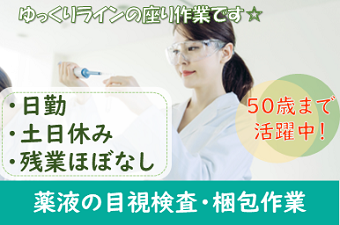 【人気の日勤専属】×【土日休み】×【座り作業】人気集中のお仕事で勤務スタート♪容器に入った薬液の目視検査♪ゆっくりのライン作業♪☆男女活躍中☆週払い制度あり☆