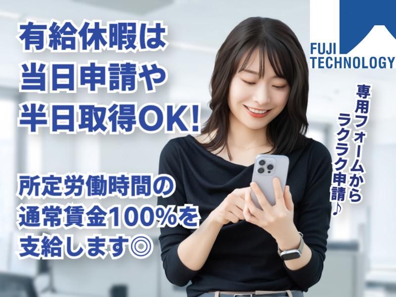 待遇・福利厚生 | 【保険制度】 雇用保険、労災保険、健康保険、厚生年金 【福利厚生】 待遇・福利厚生 【福利厚生】 ■交通費規定支給 ■無料駐車場完備 ■有給休暇制度 ■制服貸与 ■資格取得制度 ■正社員登用制度 ■有給申請はWEBフォームで簡単申請(当日でもOK) ■人間ドック(3万円程度)全額会社負担 ■キャリアアップ研修 ※規定あり 【富士テクが選ばれる理由】 年次有給休暇取得時は所定労働時間分の通常賃金(100%)を支給します 働く環境や条件は大事なポイントですよね!気持ちよく職場で活躍できるよう待遇面はしっかりサポート◎ あなたも「富士テク」でお仕事始めましょう! - まずは、あなたの今までのお仕事のご経験や、今後の働き方のご希望などお聞かせください。 WEB面談・来社面談・出張面談なんでもOKです! - |