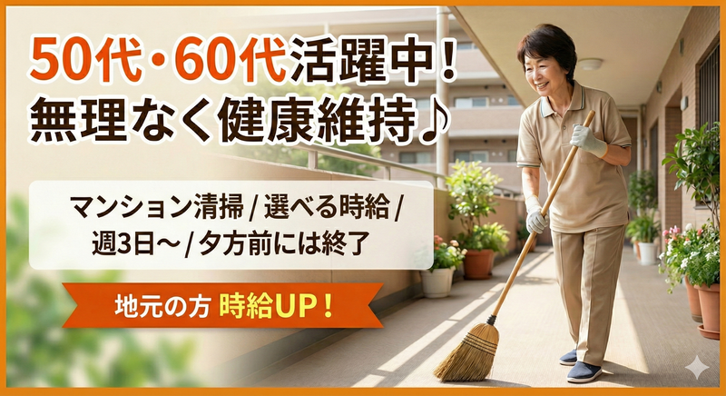 職種/仕事内容 | 仕事内容 【求人のポイント】 ★シニア応援・中高年応援! ★60代活躍中!定年後のセカンドキャリアに最適 ★ご近所さん必見!「交通費なし」は時給20円UP ★夕方には終了!家事や趣味の時間もたっぷり確保 - 【仕事内容】 マンション共用部分の日常清掃をお任せします。 A棟からC棟までをスタッフで手分けして担当していただきます。 ・廊下の掃き掃除 ・手すりやドアなどの共用部拭き掃除 ・マンション外周(敷地内)の清掃 など ・難しい機械は使いません。 - 【教育について】 入社後には研修+先輩が1つ1つ丁寧にお教えするので 未経験の方も安心してご応募ください。 - 【職場について】 50代、60代のスタッフが中心です。 「健康維持のために体を動かしたい」 という理由で始めた方が多数。 静かな環境で、自分のペースを守りながら コツコツ作業できます。 |