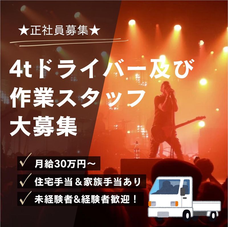 職種/仕事内容 | 仕事内容 -アピールポイント- ✅【年収550万円も可能】 昇給・賞与年2回で安定収入 ✅【住宅・家族手当あり】 地方の方には社宅完備! ✅【大型イベントに携わる】 社会貢献度の高い仕事 ✅【資格取得支援制度】 免許アップグレード可! |◤ お仕事内容 ◢|  ̄ ̄ ̄ ̄ ̄ ̄ ̄ ̄ ̄ ̄ ̄ ̄ ̄ ̄ ̄ ̄ ̄ ̄ ̄ ●イベント用仮設トイレの配送と 現場での作業をお任せします。 具体的には… ◆【配送・運搬業務】 └ 2~4トントラックへの仮設 トイレの積み込みと日本各地の 現場への配送 ◆【現場での設置・撤去作業】 └ イベント現場での仮設トイレの 設置、イベント後の撤去作業 ◆【準備・点検業務】 └ 配送前の機材の点検や、 事務所での準備作業 ◆【事務的な作業】 └ 簡単な報告書の作成 *取扱製品は仮設トイレです。 【職場環境】 ◆【多様なメンバーが活躍】 男女、未経験者、経験者、 県外からの転職者が活躍中 ◆【充実の福利厚生】 住宅手当、家族手当、安全手当、 など手当が充実 ⭐経験・スキルを問わずに活躍可能⭐  ̄ ̄ ̄ ̄ ̄ ̄ ̄ ̄ ̄ ̄ ̄ ̄ ̄ ̄ ̄ ̄ ̄ ̄ ̄ 未経験の方も大歓迎です。 入社後は、一つひとつ丁寧に お教えしますのでご安心ください。 いきなり一人で現場に行くことは なく、複数名で行う業務が 中心となります。 経験者はもちろん、ブランクがある 方も積極的にご応募ください。 ⭐キャリアアップについて⭐  ̄ ̄ ̄ ̄ ̄ ̄ ̄ ̄ ̄ ̄ ̄ ̄ ̄ ̄ ̄ ̄ ̄ ̄ ̄ ステップアップ制度があり、 中型免許、ユニック免許、 フォークリフト免許など、 業務に必要な資格を会社支援で 取得できます。 評価に基づき昇給・昇格の機会があり、 入社3年目で年収550万円の 社員もいるなど、頑張りを しっかり評価します。 ⭐会社紹介⭐  ̄ ̄ ̄ ̄ ̄ ̄ ̄ ̄ ̄ ̄ ̄ ̄ ̄ ̄ ̄ ̄ ̄ ̄ ̄ 当社は、日本三大音楽フェスや 国際スポーツ大会、官公庁、 地方自治体など、大型イベントの 企画・設営・施工管理に 携わっています。 社会に不可欠なインフラを 支えることで、大きなやりがいと 安定性を感じられる事業領域です。 |