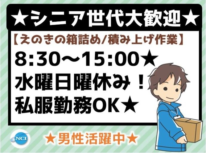 職種/仕事内容 | 仕事内容 【工場内作業員】 ◎えのきを生産する工場にて下記業務をお願いします!! ・えのきの箱詰め作業 ・段ボール積み上げ作業 ※基本的に立ち作業です。 ※出荷用にえのきを詰めた段ボールを指定の場所まで運んで積み上げます!多少力が必要になりますよ! ===================== ◎ココ見て!求人の魅力◎ ===================== ■細かい作業は一切ナシ! ■今スグ働けるパートタイム! ■シニアの方も大活躍中! ■希望により給料週払い対応! =================== ★こんな方にオススメ★ =================== ■未経験でできる軽作業がしたい! ■異業種へのチャレンジ希望! ■カンタンな作業希望! ■夜はゆっくり過ごしたい! ====ここもチェック!==== ◇未経験者歓迎 ◇経験者歓迎 ◇有資格者歓迎 ◇フリーター歓迎 ◇U・Iターン歓迎 ◇ブランクOK ◇残業月20時間以内 ◇学歴不問 ◇長期 ◇週4日以上OK ◇40代以上応募可 ◇50代以上応募可 ◇60代以上応募可 ◇家庭都合休OK ================== |